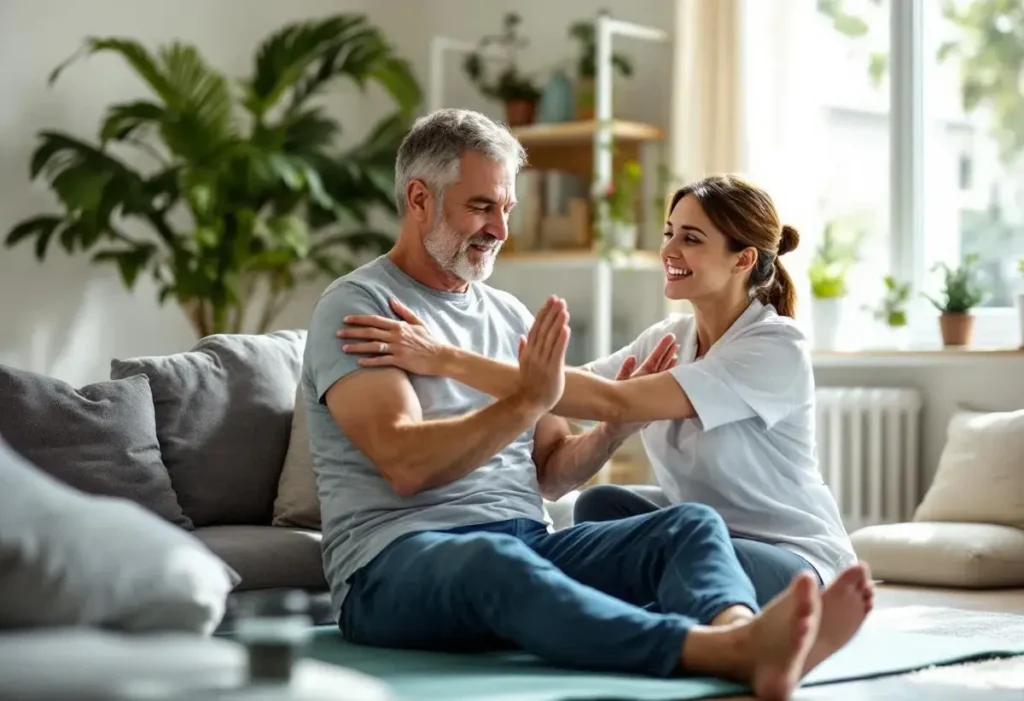 Commencez la kinésithérapie avec des exercices d’étirement et de renforcement profond. Augmentez progressivement la durée des marches, puis l’autonomie aux gestes quotidiens. Évitez le port de charges supérieures à 3 kg et les torsions violentes. Prévoyez un contrôle médical et adaptez l’effort au ressenti.